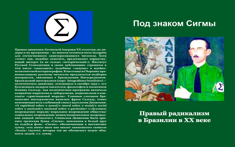 В настоящем Сборнике правомыслящему русскому читателю предлагается подборка материалов, связанных с Бразильским Интегрализмом. Бразильский интегрализм (порт. Integralismo brasileiro) — политическое движение, основанное в октябре 1932 г, его безсменным лидером писателем, философом и политиком Плиниу Салгаду. Символом Движения была принята греческая буква «Сигма», вписанная в белый круг на голубом фоне. «Сигма», обозначающая в математике сумму, есть ничто иное как аналог знаменитого символа «fascia» (пучок), которая так же обозначает некую общность людей, т.е. сумму